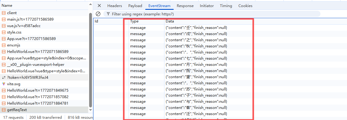我们可以在浏览器中看到 能识别的数据会在eventStream里列出来